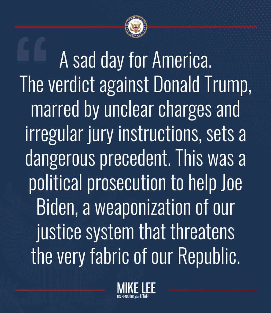 Senator Lee joined other senate Republicans in a statement issued May 31: “The White House has made a mockery of the rule of law and fundamentally altered our politics in un-American ways. As a Senate Republican conference, we are unwilling to aid and abet this White House in its project to tear this country apart. To that end, we will not 1) allow any increase to non-security related funding for this administration, or any appropriations bill which funds partisan lawfare; 2) vote to confirm this administration’s political and judicial appointees; and 3) allow expedited consideration and passage of Democratic legislation or authorities that are not directly relevant to the safety of the American people.” In addition to Senator Lee, this document was signed by Senators J.D. Vance, Tommy Tuberville, Eric Schmitt, Marsha Blackburn, Rick Scott, Roger Marshall, and Marco Rubio.