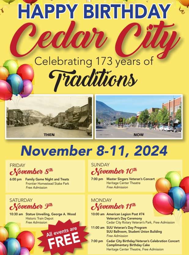 CEDAR CITY, UTAH – Starting Friday, November 8th join Cedar City in celebrating 173 years of traditions with four days of events honoring local history and traditions.